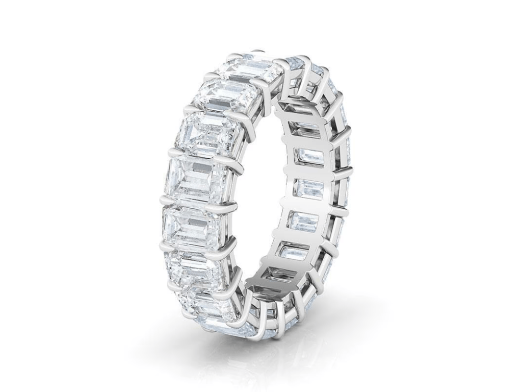 An eternity band features diamonds that go all the way around the ring, symbolizing eternal love, unbreakable commitment, and infinite connection.