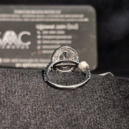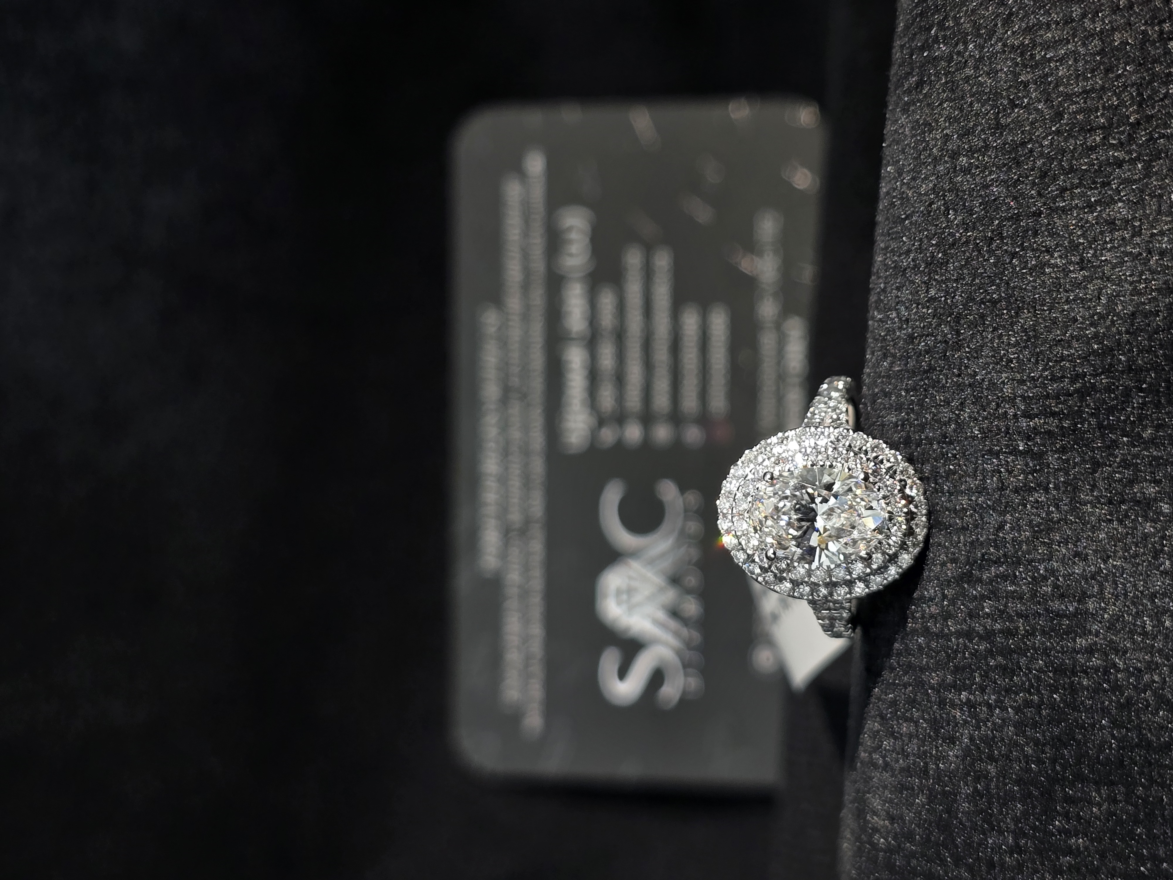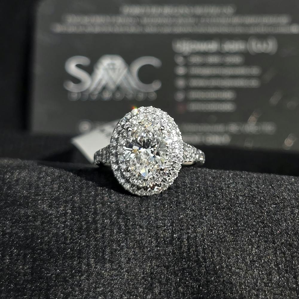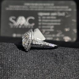 Setting: Double halo, split shank, pave band 50% coverage, 4 prong