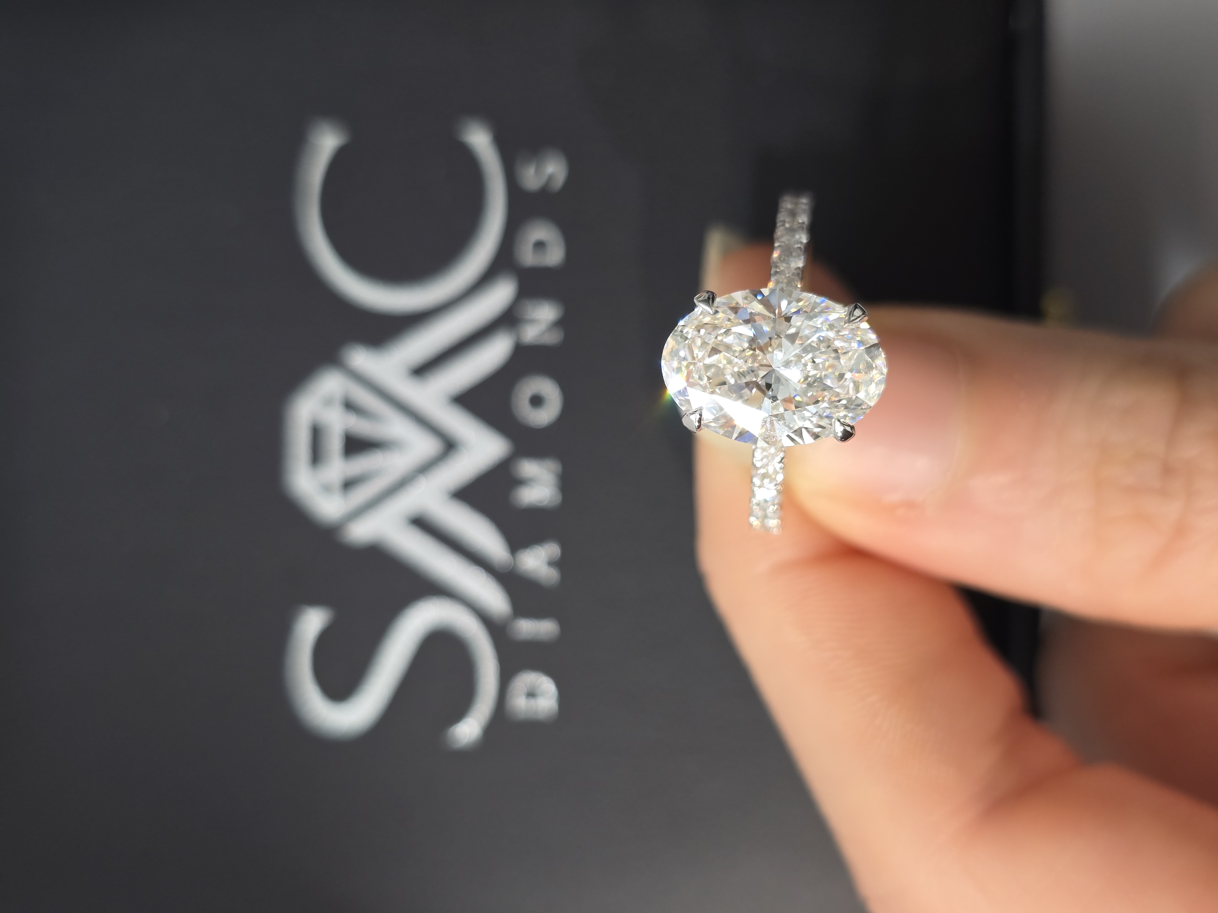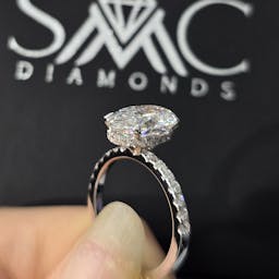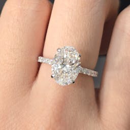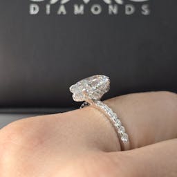 Setting: Solitaire with pave band 50% coverage, 4 prong setting, hidden halo outside prong