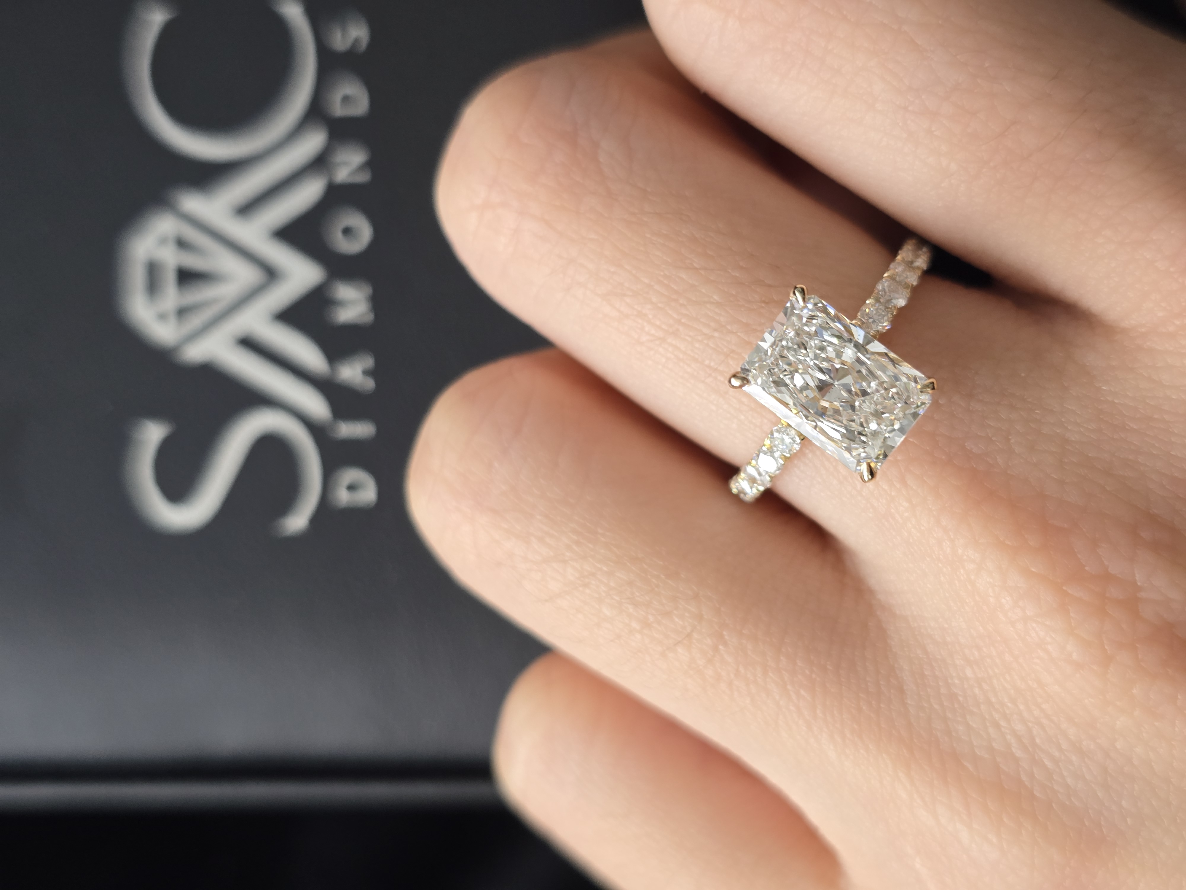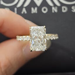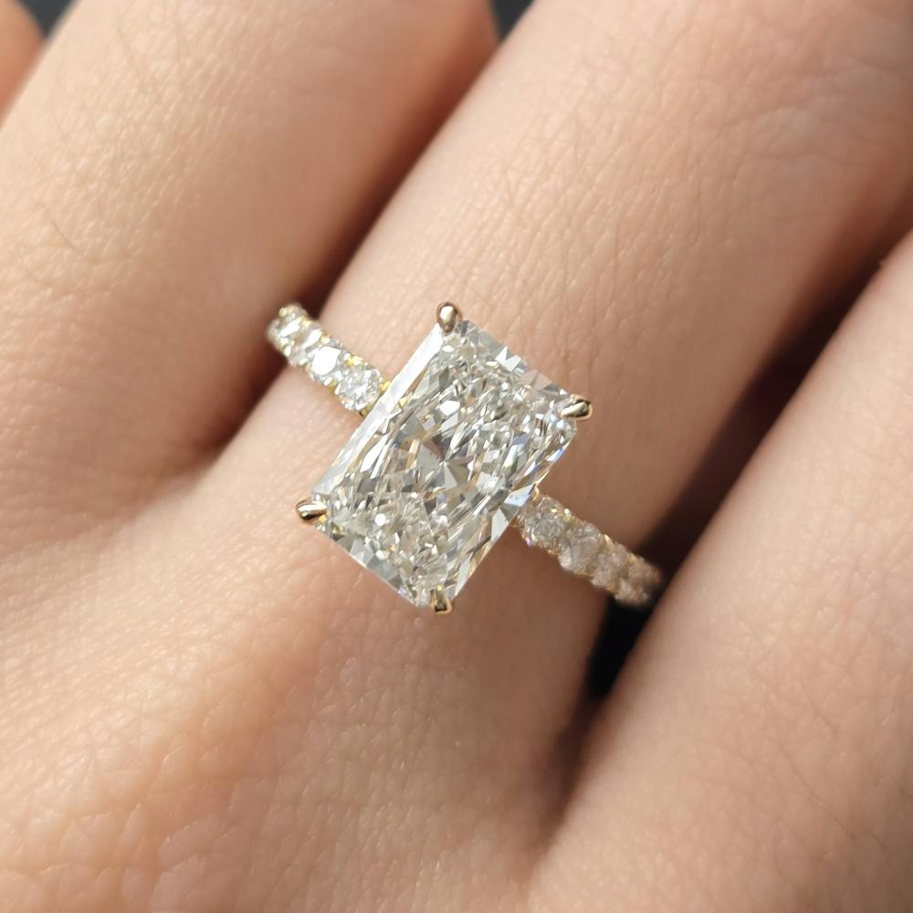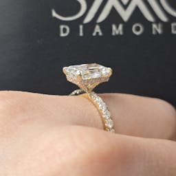 Setting: 4 prong setting, hidden halo outside prong, diamond on prong, pave band 75%
